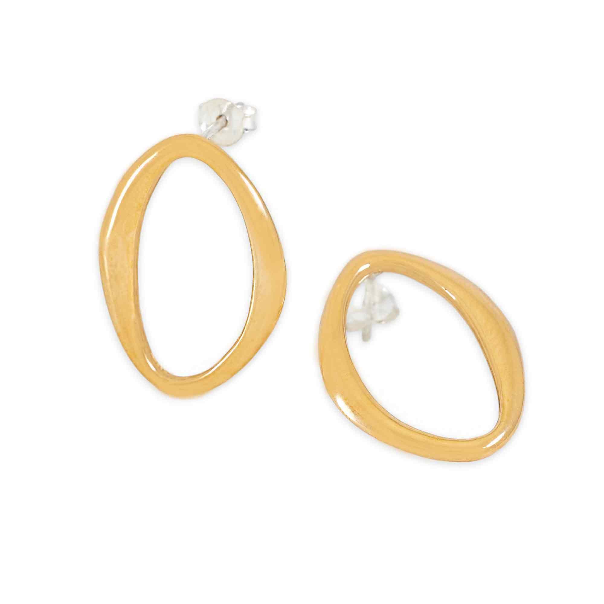 Add a touch of bold minimalism to your everyday look with these bronze asymmetrical oval post earrings. Featuring an organic, freeform design, each earring has a unique silhouette that embraces the beauty of imperfection. The open oval shape is fluid and modern, crafted in warm golden bronze with a high-polish finish that catches the light just right.