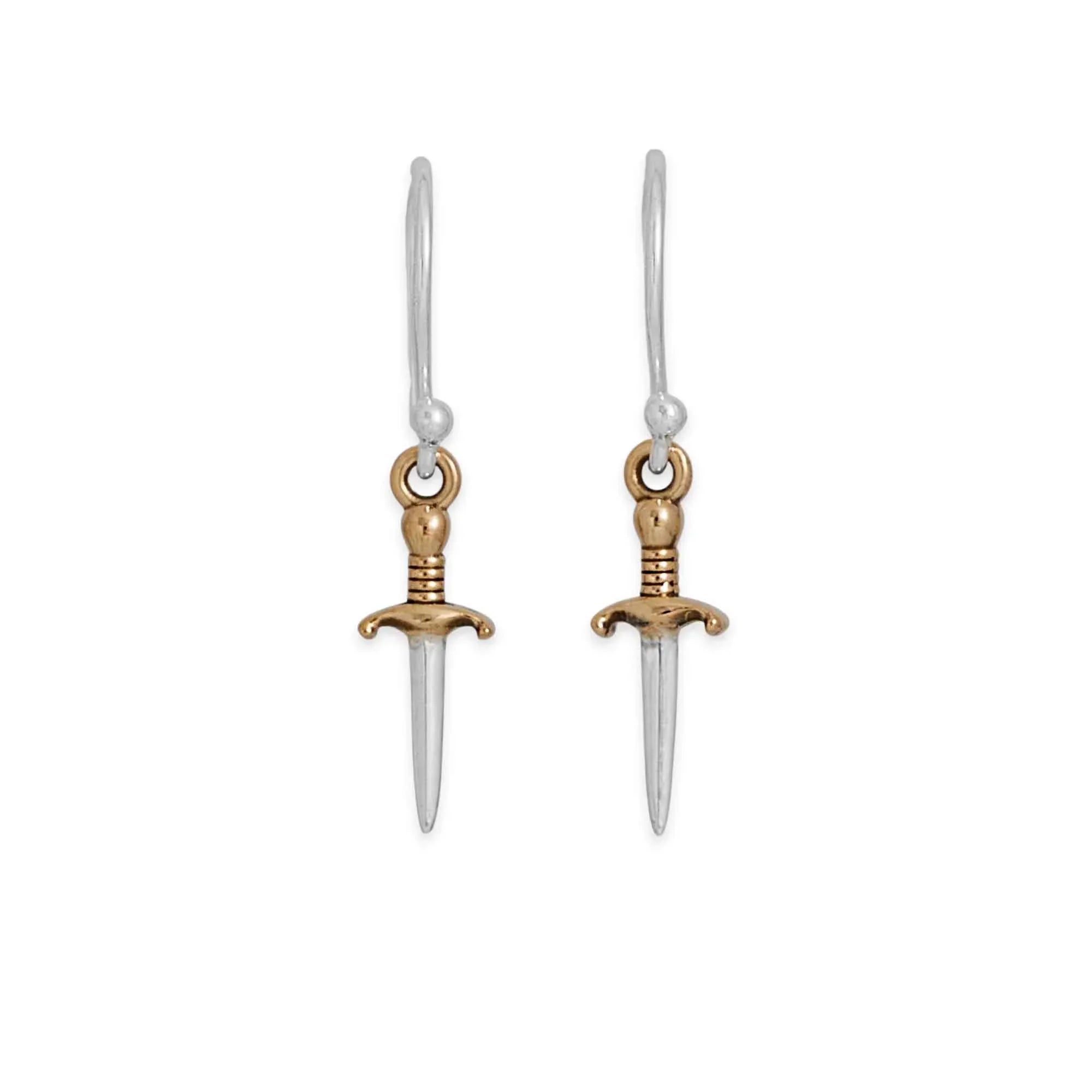 All parts of this mixed metal mini dagger post earrings are wonderfully detailed. From the point to the pommel, this dagger looks like the real thing. The pronounced quillion and the twisted grip are especially fierce! Perhaps the earliest of concealed weapons and often a warrior's last defense, daggers represent betrayal, loss, protection, valor, and sacrifice.