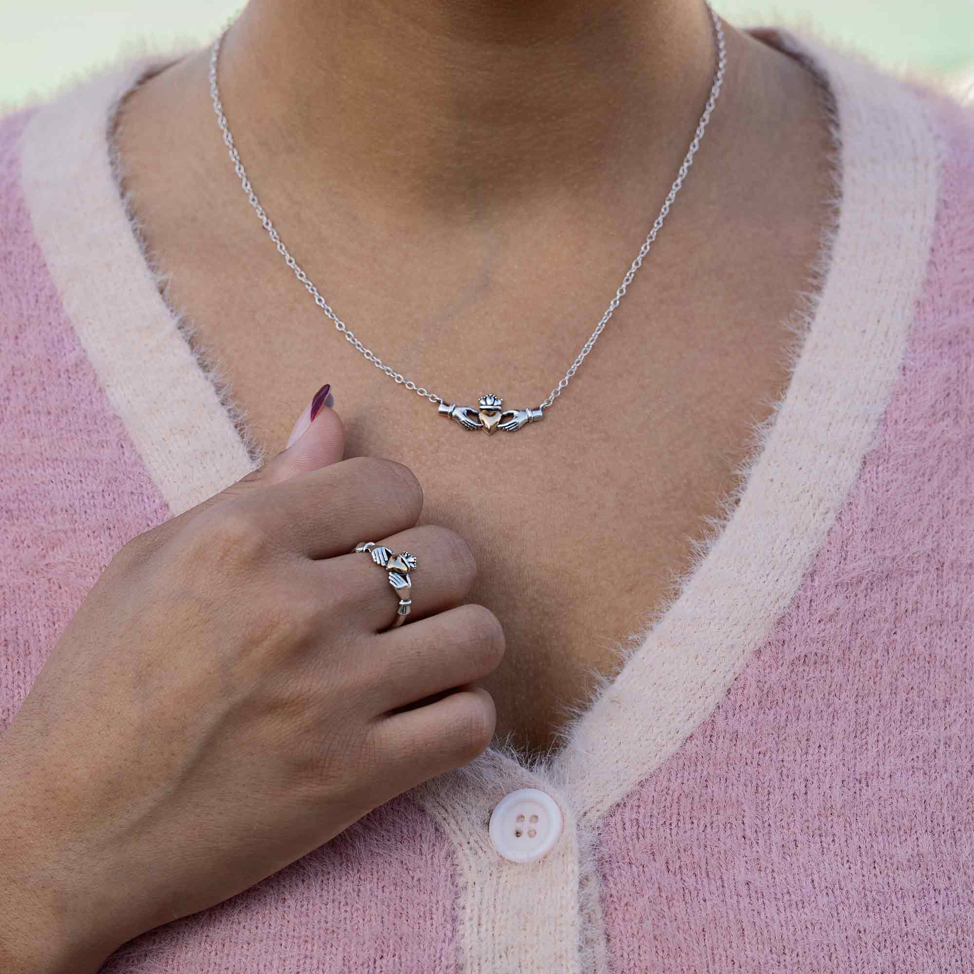 A timeless symbol of love, loyalty, and friendship — this mixed metal Claddagh heart festoon necklace beautifully blends tradition with modern design. Crafted in sterling silver and bronze, the iconic hands cradle a warm bronze heart topped with a silver crown, representing friendship, love, and loyalty. The festoon style drapes gracefully along the neckline, making it an elegant statement piece for any occasion. Wear it as a daily reminder of meaningful connections and enduring love.