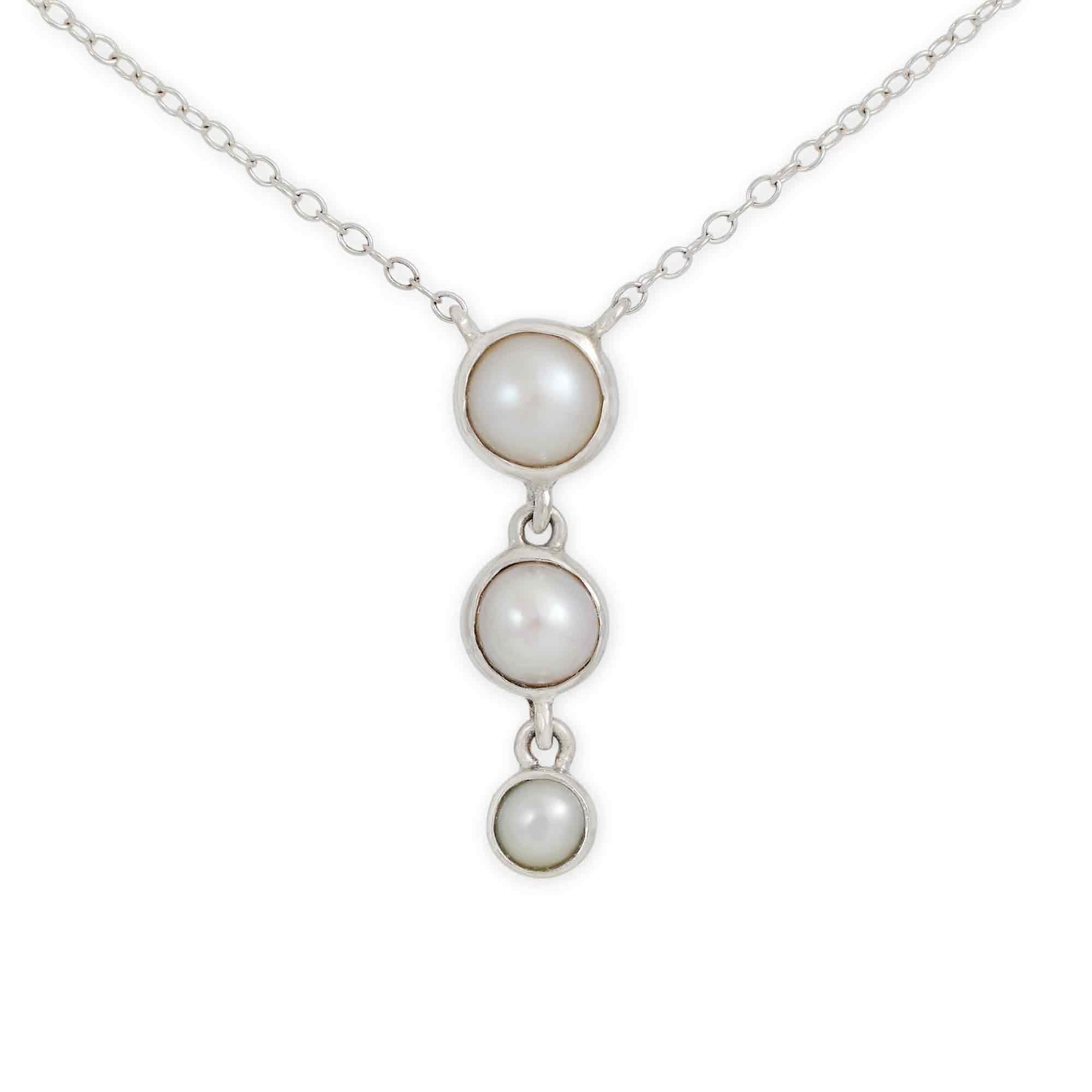 Graceful and timeless, our Sterling Silver Triple Pearl Drop Necklace embodies modern simplicity and classic elegance. Three lustrous pearls hang vertically in perfect harmony, their soft glow enhanced by clean silver lines. The minimalist setting highlights the organic beauty of each pearl, creating a design that feels balanced, refined, and effortlessly chic.