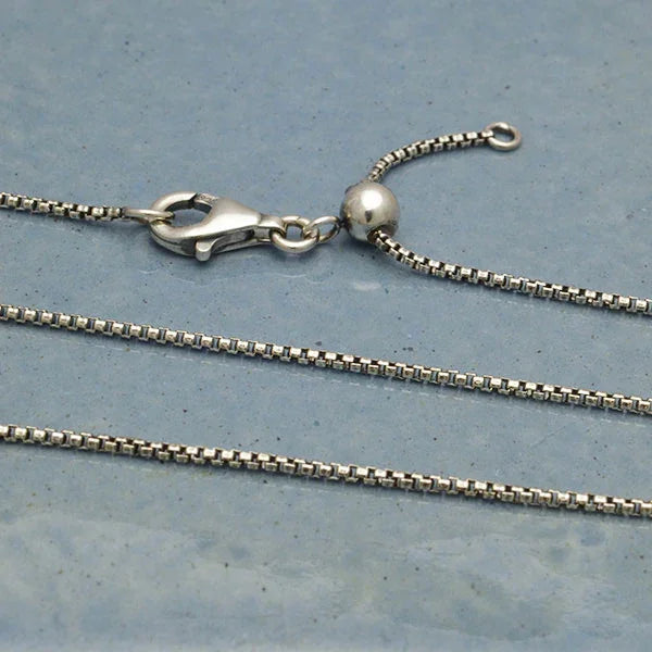 Experience effortless versatility with our Sterling Silver Box Chain with Slide Bead, a delicate yet durable design perfect for layering or everyday wear. This adjustable chain glides smoothly through a small slide bead, allowing you to customize the length up to 22 inches. Whether you prefer a close choker style or a longer pendant length, it offers flexibility with timeless elegance.
