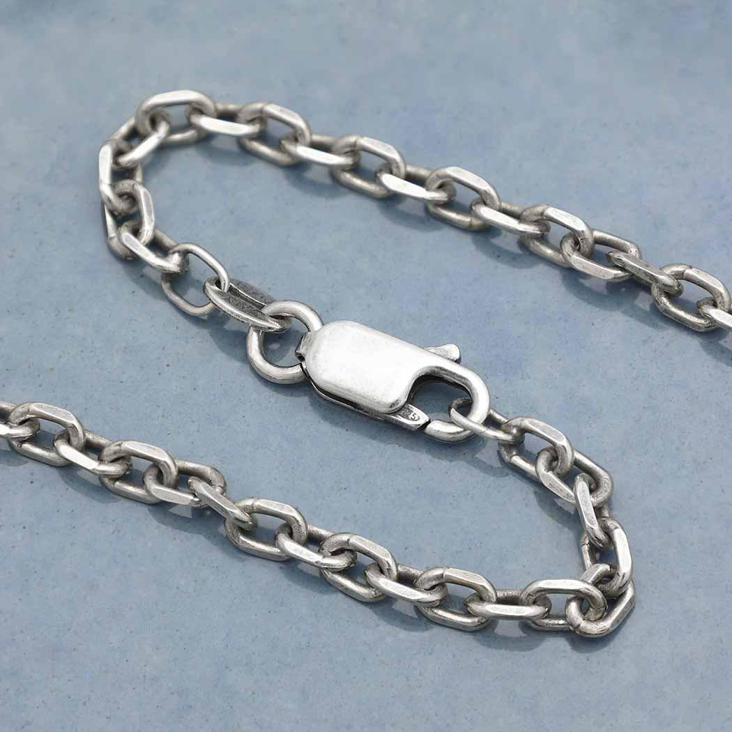 Each oval link is faceted to reflect light beautifully, creating a polished texture that shimmers with every movement. The links measure approximately 5mm by 3mm, offering both durability and visual presence. Light oxidation enhances the depth of the silver, highlighting the crisp edges of each facet. Finished with an 11mm lobster clasp, this chain is both secure and easy to wear.