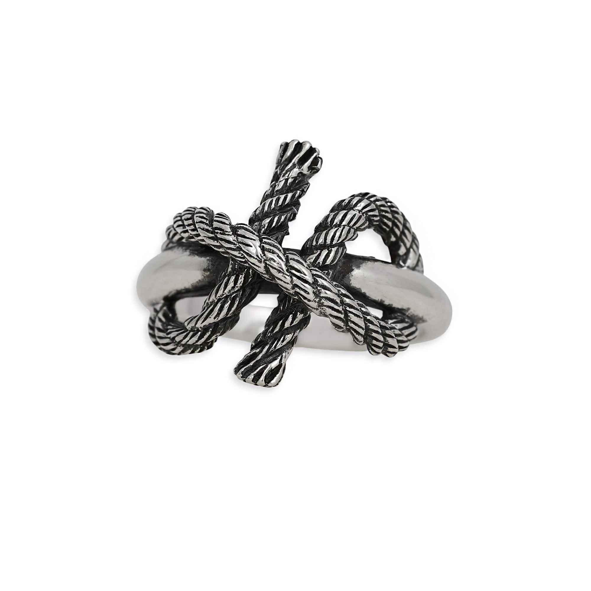 Crafted in sterling silver, this ring features a sculptural clove hitch knot wrapped seamlessly across the band. The interwoven detail adds depth and movement. The polished finish highlights the dimensional form.